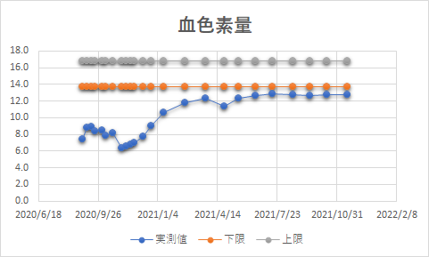 時系列グラフで見た方が早いと思いますが、白血球:引き続き正常域内 血色素量:CAR-T治療後15カ月間正常下限を下回ったまま(直近半年位は下限に近い所に居るけれど・・)血小板:正常下限を上下に移動 IgG:輸血すると50位上がり、しないと50位下がるということの繰り返し といった事が続いています。