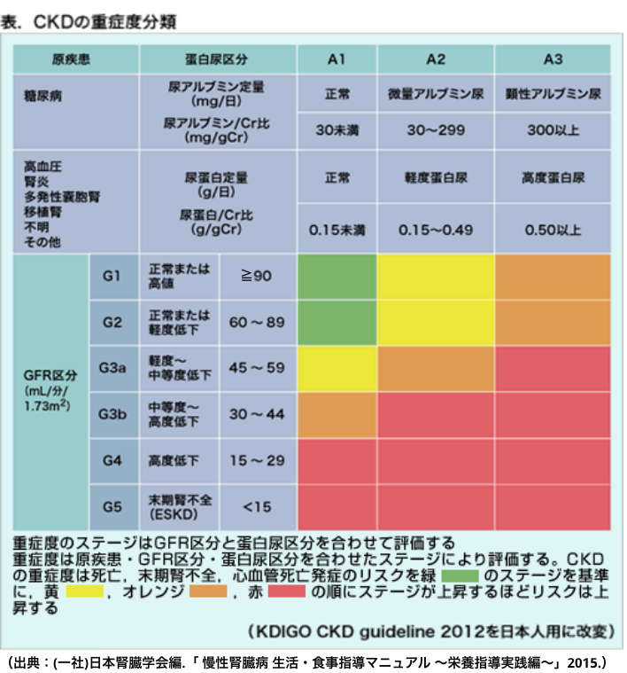 血液検査で分かるGFR値と尿アルブミン・尿蛋白、3つの要素の組み合わせで重症度を判断するそうです。私の場合は尿アルブミン・尿蛋白ともに正常でGFR値が45~59ですので(A1G3a)黄色のところに該当します。