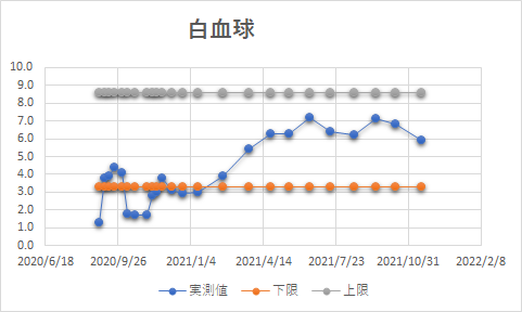 | WBC(白血球) | 10*3/μL | 5.9 | 8.6 | 3.3 | |