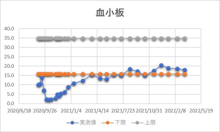 グラフを見てお分かりの通り血球3ついずれも正常範囲内で傾向もほぼ変化なしです。白血球は毎回数値が変動、血色素量・血小板は正常下限に張り付いたままです。なお、先月ブログでも書きましたが、赤血球は今回も正常下限をかなり下回っていました。経過観察18か月目:PET検査問題無し/血球OK/免疫やっぱり低下/CAR-Tは依然元気? – CAR-Tで悪性リンパ腫寛解 (positive-enma.com) でも、退院後数か月の様に上り坂がきつかったりせず、ゴルフで2万歩以上歩いても大丈夫なので問題なしと思っています。