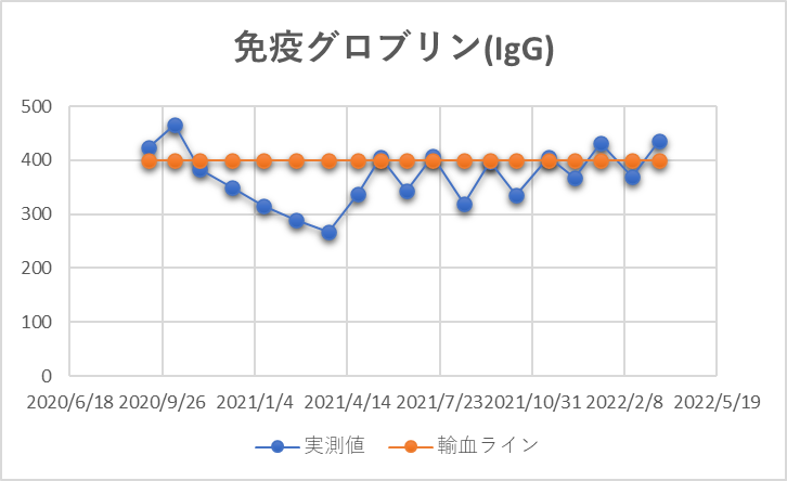 先月の輸血効果で435mg/dLと輸血ラインを上回りました。隔月で輸血となる現象が繰り返されています。ですが、上のグラフのジグザグ線が気持ち右肩上がりの様に思えます。つまり、輸血が必要なくなる時期がくるのでは?と、少しだけ期待しています。