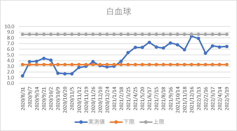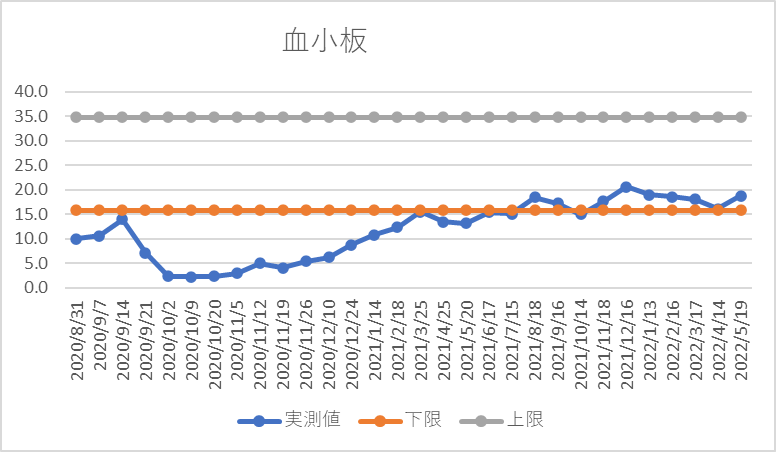 血球は前月と全く同じと言っていい結果でした。血色素量の数値は前月よりやや上がったものの僅かに正常下限に届きませんでした。といっても、グラフを見るとこの1年くらいほとんど変化が無いとも言えます。