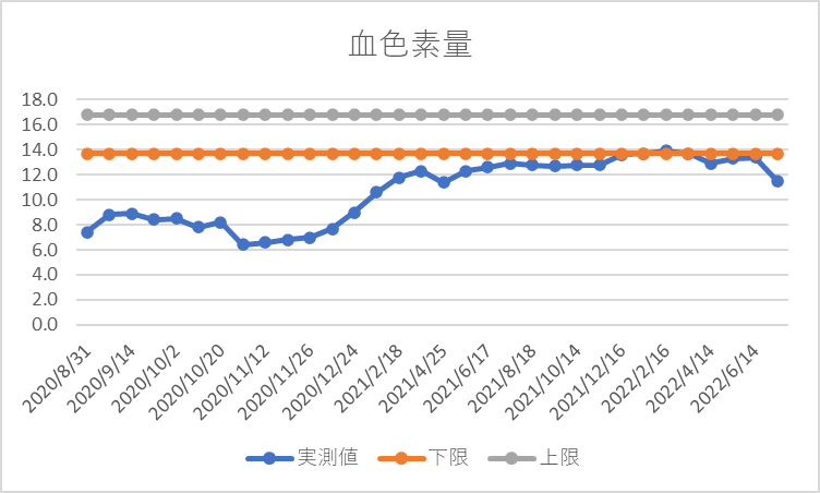 | HGB(血色素量) | g/dL | 13.4 | 11.5 | L | 13.7 | 16.8 |