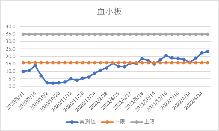 | PLT(血小板) | 10*4/μL | 22.3 | 23.3 | 15.8 | 34.8 | |