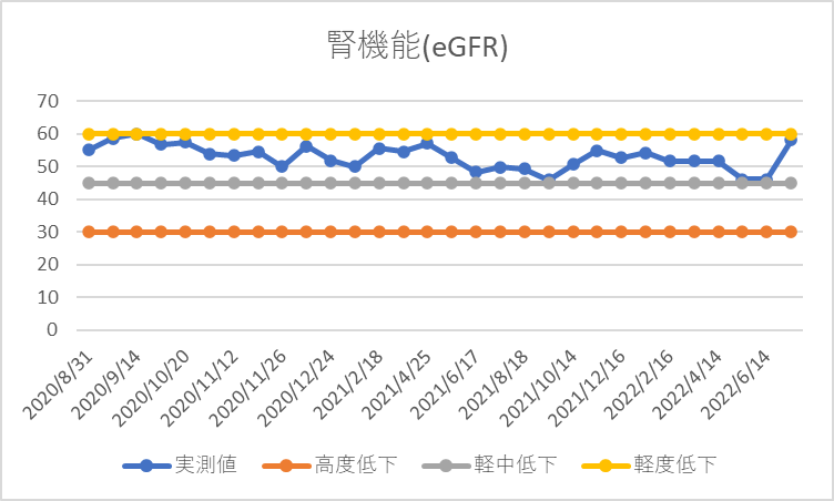 7/15の数値を見てください。クレアチニンが正常値(上限に近いですが)に入りました。eGFRも一気に12増加して58.2ともう少しで正常範囲の下限である60に届くところまできました。