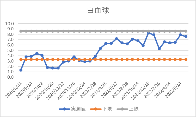 | WBC(白血球) | 10*3/μL | 7.9 | 7.6 | 3.3 | 8.6 | |