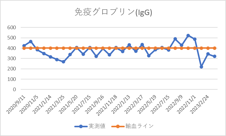 時間軸が同じではないので見難いのですが、アルブミンも免疫グロブリンも1月31日が最低。その後の2月24日・4月4日と同じ様な折れ線グラフになっています。ほぼ毎回成分輸血をしていてこのような数値なので栄養状態維持の大切さを思い知りました。