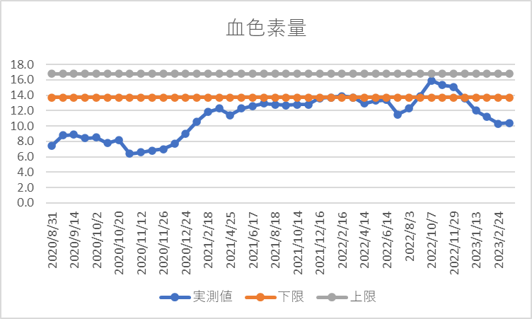 大きな変動はなく、白血球・血小板は正常値範囲内、血色素量は本年に入って全て正常下限未満です。