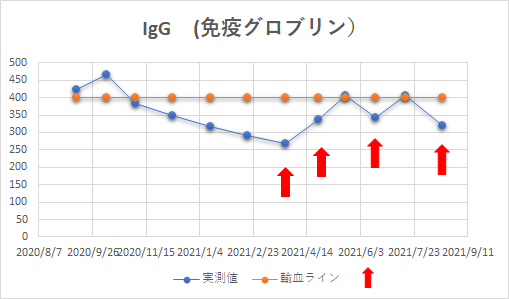 血液検査結果の表に記載した通りIgGの値は前月より低下し400を切ってしまった。このグラフからも明らかな通り、400を切る→成分輸血→400回復→輸血なし→400を切る→成分輸血というサイクルから抜け出せずにいる。1年前に輸注を受けたCAR-T細胞が未だに元気である証拠という事なので、寛解継続に大いに役立ってくれている事は確かだが、IgGの正常下限が861という事を思い出すと何とも言えない気分でもある。