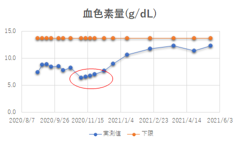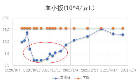 白血球は比較的早く昨年内に正常値に戻ったが、血色素量と血小板は最近ようやく下限に近付いてきたところ。グラフの中で赤い楕円で囲ったところは、それぞれの血球の果たす働きがかなり弱まっていてとても用心しなければならない時期だった。白血球だと抵抗力が弱く、血色素量だと身体中に酸素を送る力が弱く、血小板だと出血が止まらない・・となる。実際、血色素量が8を切っている頃は、ゆっくりしか歩けず上り坂がキツかった。インフルエンザの予防接種も受けていない、新型コロナウィルスが猛威を振るっていたので、とにかく通院以外は出歩かない。ケガで出血したら止まらないので、転ばない様に・・・・病人なので仕方がないが、用心用心の毎日だった。